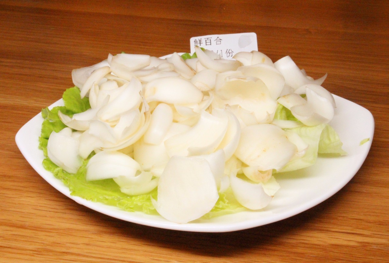 听见毛肚两字,就想到四川火锅中大片大片的毛肚,然而并非如此,竹毛肚,即竹荪盖。便是那平时常见的竹荪上面的菌帽。入口清脆爽口,蘸上特质的蘸碟,纯正的辣味和毛肚融合,感觉各个味蕾都打开了气孔,肆无忌惮的想要把这种香气纳入,占为己有。 蔬菜 鲜百合