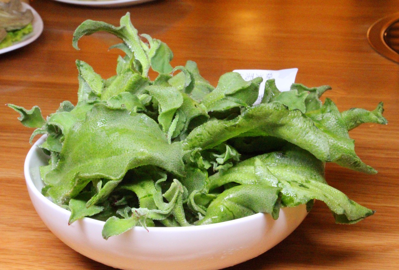 对于冰草,城城对那清脆爽口的冰凉感有着独特的好感。其两种吃法,一种是蘸以调好的酌料,吃到嘴里,味道咸香,带着微微的辣味。另一种则是在汤锅里烫着吃,9秒时间眨眼即过,却让冰草的口感变得更加清脆,植物的清香更加浓郁。 海带