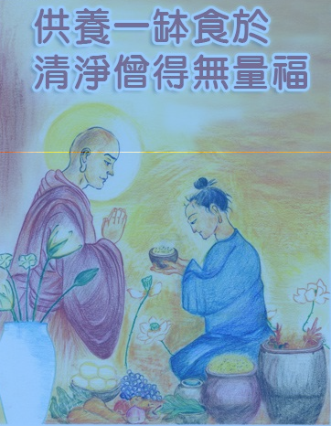 往昔,在释迦牟尼佛住世时,佛陀的姨母大爱道特地以金缕织成衣服,供养世尊。世尊开示大爱道说:‘拿去布施给僧众吧!’大爱道疑惑的问:‘世尊是我从襁褓时以母乳亲自养育长大,如今我亲手缝制此衣,是特意为了供奉佛陀而织的啊!当然希望如来接受此供养,为什么世尊却要我将衣布施僧众呢?’世尊回答:‘因为供养众僧的福报,广大无边。为了让姨母得大功德,所以我如是劝姨母。姨母如果依照我所说去做,就是已经供养了佛。’