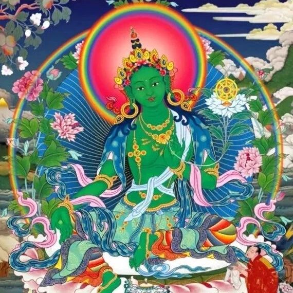 第二尊度母是“妙音天母”,又作“妙音天女”,其他版本也作“勇猛白度母”“月色度母”等。她的身体是白色的,无比光明;左边正中盛开的莲花上面有白色的满月,满月里边有“施”字;妙音天母具有无上的智慧,并且辩才无碍。但有一点格外要注意:“妙音天母”不是长寿三尊里边的白度母!“敬礼秋宵朗月母,普遍圆满无垢面。”首先,我们依旧是以清净的三门敬礼“至尊勇猛白度母”,这句是赞叹妙音天母的面色。她的面色是什么样子的呢?就像把秋天夜晚的十五圆月聚集在一起一样,皎洁明亮,没有任何垢染、美丽圆满、让人喜爱。“如千星宿俱时聚,殊胜威光超于彼。”这句话有两种解释:一种是对妙音天母身色的赞颂。从外在的身色上看,度母身上闪烁的种种光芒,就像千万个星星聚在一起,群辉闪耀、清晰明亮,而且度母殊胜的威光更加超过这千万个星宿聚集在一起的光芒,这就是“妙音天母”的殊胜形象。二是对妙音天母智慧的赞颂。从内在来讲,这尊度母有着佛陀的“如所有智”和“尽所有智”,藏语是“南钦,杰打威南钦,杰巴南钦”。妙音天母可以清晰明了地分辨所有事物的法身法性,一点都不会混乱,她的智慧就像千万个星星聚在一起一样光明无碍。“妙音天母”的智慧和辩才也是非常殊胜的。如果我们智慧不足、口才欠佳,就应该时常供养、祈祷妙音天母,这样我们的智慧和辩才就能很快得到提升。