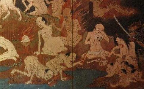 饿鬼的吓人之处在于他们长相难看,躯干和四肢大小极不相称,巨头乱发,头很大头发很乱,像钢针一样,像刺猬一样。脸上布满皱纹,脖颈极细撑不起头颅,脖子非常细,有的鬼肚大如瓮,像瓮一样一个大包。咽细如针,咽喉细如针。所以他脖子也非常细,由于长期的干渴,饿鬼最大的特点就是一个长期的饥饿和渴,由于长期的干渴,饿鬼身体中没有丝毫像血和脓等含水分的东西。饿鬼身上就没有像血和脓一样的东西,因为血和脓它含有水分,饿鬼身上是没有任何水分。他们就像底下一个比喻,干皮革包裹的枯木,干皮革知道吧,皮革就是我们做背包的皮,做腰带的那个皮,是干的。我们这个背包还是加工过的,就是干皮革包裹的枯木,枯木就是干木棍。将要腐烂的干木棍就是枯木。所以他们的身体是这样。干枯的皮肤覆盖着枯萎的筋和脉,他也有筋他也有脉,但是非常枯萎的没有一点水分。走动的时候,手臂和腿脚关节会相互的摩擦,像枯木互相撞击一样。发出破裂的声音,并且有时候冒着火星子。一走动他关节当中冒火星子,没有水分没有润滑的作用,又像石块互相撞击一样,冒出一簇簇火星。由于饿鬼千百年来得不到饮食,饿鬼的饥渴痛苦极其巨大,他们的果报就是刹那刹那就是渴就是饿,偏偏他们的果报就是内障外障,障碍他们得不到饮食。