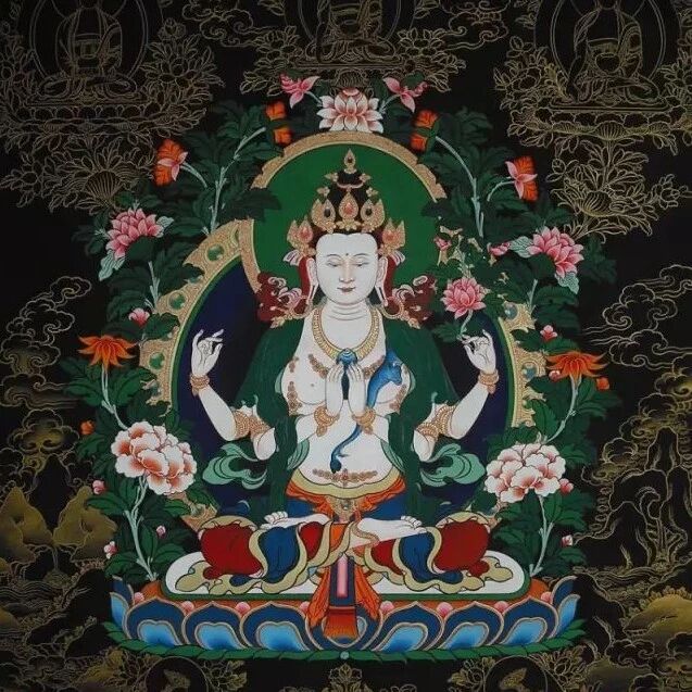 麦彭仁波切在《百咒功德》中说:“观音菩萨是见解脱、闻解脱、忆解脱、触解脱。”任何人听到观音菩萨名号或六字真言,心里忆念观音菩萨的唐卡,这个福分是很大的。我们藏地的观音形象,普遍是四臂观音、二臂观音、千手千眼观音,汉地根据《华严经》或《法华经》的描述,观音菩萨还有三十二种形象。但不管是哪一种,大家都应该经常忆念、经常观想,这样我们的相续才会逐渐被感化,从而得以清净。
