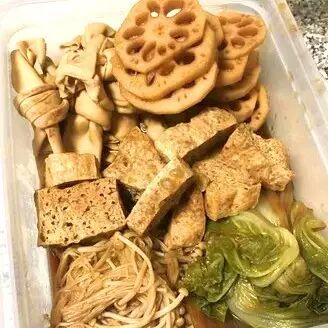 油豆腐、藕、豆皮节、白菜、金针菇、卤汁、花椒、八角、桂皮、香叶、辣椒。