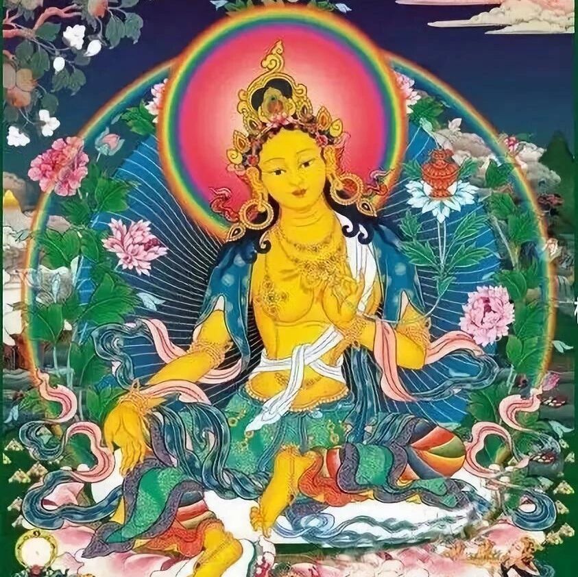第四尊度母是“如来顶髻母”,即“顶髻尊胜佛母”,因为是在一切如来的顶髻中化现出来,所以叫如来顶髻母。一切佛和佛子菩萨、空行护法都无比恭敬这尊度母,视她为佛母,把她作为自己的顶上庄严。如来顶髻母身体青色,左手所持的盛开的莲花上面有一个长寿宝瓶,可以赐予众生长寿成就。尊圣佛母也是长寿三尊里面的其中一尊,长寿三尊分别指的是无量寿佛、尊圣佛母和白度母。