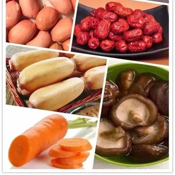 材料:藕一节、胡萝卜一根、香菇、花生、红枣、姜3~4片、盐