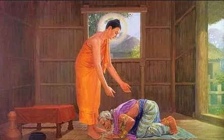 于是佛陀就把他请上台,请他讲述他感恩的故事。刚好那一天,他的五个孩子也在下面听经,他们听到自己的父亲说,对一根拐棍都要至诚感恩,何况其他!更何况对于给予自己生命的父母,如果都不知道去感恩、报恩,这样的人禽兽不如!因为乌鸦都知道反哺,羔羊也知道跪乳。于是,这五个孩子良心发现,孝心显发,听完经后,他们都争先恐后跑上台去,都争着要孝养自己的父亲。他们争着说:"到我家去!到我家去!"