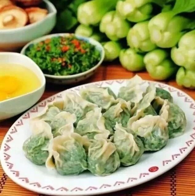 选用喜爱野菜和豆腐(打碎的)在放点麻油做馅.用备好的皮儿包饺子.