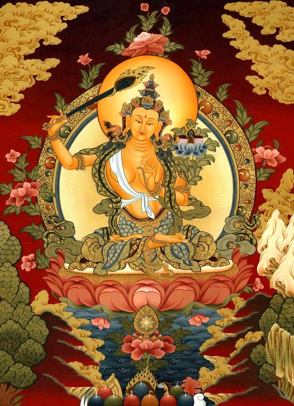 文殊菩萨心中执持般若智慧,知道一切法、一切意义、究竟本质。因为知其本质,所以看得如其原貌,看得非常清楚。唐卡中的文殊菩萨左手所拿花梗根抵达心的位置,花梗末端花心的部分是一部《般若经》,代表文殊菩萨胸中执持般若。般若为诸佛之母,诸佛因通达般若空性智慧而成佛。