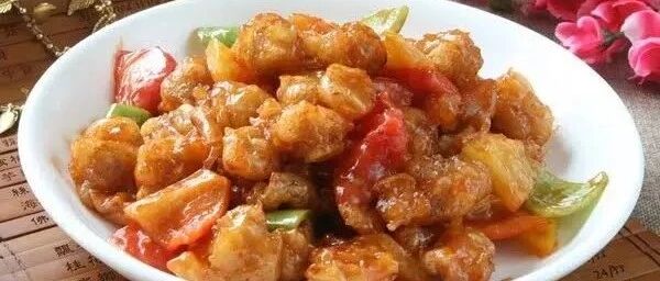(2)另起锅热油少许加入番茄沙司、适量白醋、白糖、水加入菠萝、红绿圆椒煮开后加水淀粉勾芡然后倒入炸好的猴头菇翻炒均匀即可。