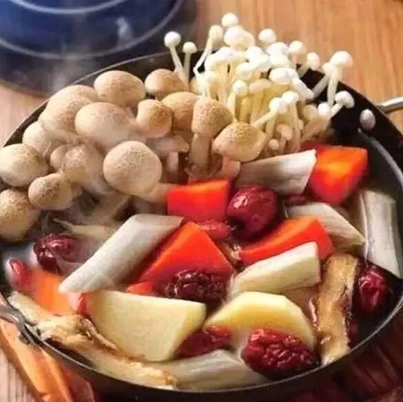 食材:山药120克,牛蒡100克,胡萝卜100克,秀珍菇80克,金针菇80克,当归2克,枸杞2克,红枣6颗,姜片5克,素高汤500毫升,盐1/2茶匙
