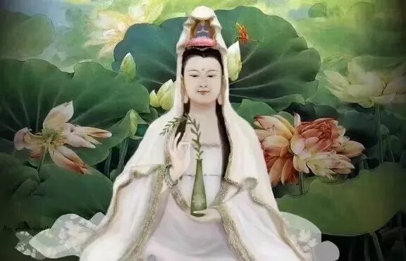 观世音菩萨还有一项美德,那就是他的头上戴了一个天冠,我们平时看见观世音菩萨头上高高的,有一块素白色的布幔覆盖着,看起来非常庄严,令人一看就生欢喜心,没有人看了观世音菩萨不生欢喜心的。你们知道观世音菩萨的头顶上那高高的东西是什么吗?那是一座佛龛,唐代的大画家吴道子,将那么佛龛画成为发髻的样子,看起来是很美,很庄严,各位不可以将它当成发髻看啊!那是佛龛啊!观世音菩萨为什么要将一座佛龛安在头顶上呢?因为他要供养恭敬一尊佛,那尊佛就是“阿弥陀佛”。如《观无量寿经》上说: “‘观世音菩萨’以毗楞伽摩尼宝,以为天冠,其天冠中,有一位化佛,高二十五由旬。”
