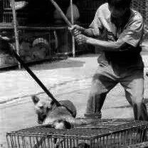 这是广州这家动物市场里的屠狗过程:选定一只狗,将它的脖子用火钳牢牢夹住,从笼子里拖出来,这时狗挣扎、狂吠,而刽子手用木棒向狗的头部狠击,一下、两下……躺倒的狗被割喉放血,有的狗这时仍在抽搐。血流尽之后,狗被扔进滚水翻腾的大锅褪毛。