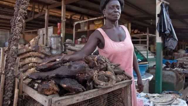 剥皮猴子、发黑肉与“鲜肉”们,在这里有一个统一的名字——“丛林肉”。在撒哈拉沙漠以南的非洲,这种特殊的丛林肉并非来自畜养的家禽或牲畜,而是来源于非洲热带丛林中的猩猩、猴子、鼠类、羚羊或果蝠等野生动物。