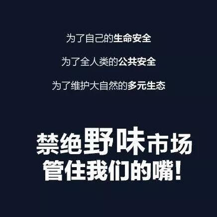 公安部食药侦局提示:非法狩猎、售卖野味带来的不仅仅是安全健康危机,还将面临牢狱之灾。为了您和他人的生命健康,请拒绝狩猎、贩卖、食用野生动物!