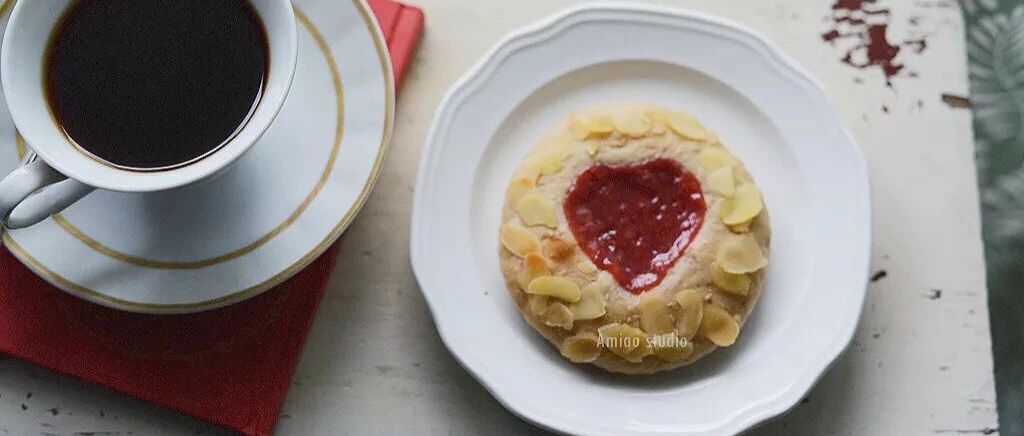 然后把草莓果酱装入裱花袋,挤入心形的凹槽里。表面可以撒巴旦木片装饰。