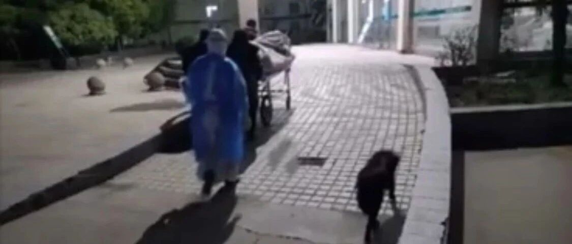 护士将担架抬走后,金毛在一旁跟着护士们的步伐走着,一边摇着尾巴看着自己的女主人,