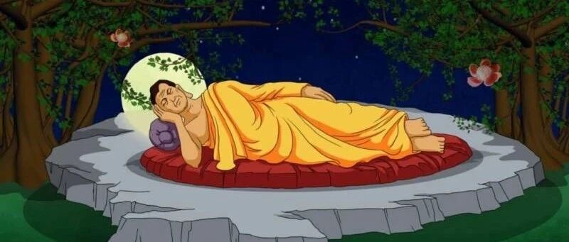 公元前486年,释迦牟尼八十高龄,传教已四十九年,佛教已被南亚大多数人所接受,各地均建立了寺庙,出家的和在家的信徒倍增,这时,释迦牟尼背疾复发,自知将要谢世,便来到拘尸那伽的跋提河边,在两棵婆树间弟子阿难系好绳床,释迦牟尼:头朝北,面朝西,侧卧于绳床上,他的右手支着头,左手放在身,双足并拢,在农历二月十五,进入“涅槃”,心脏停止了跳动。