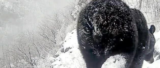 雪地上也留下了一串熊妈妈的和人类的脚印。