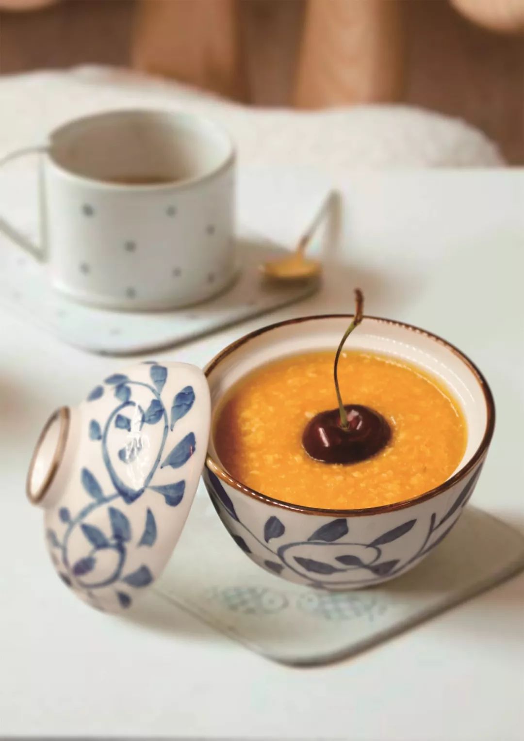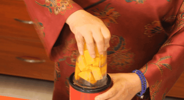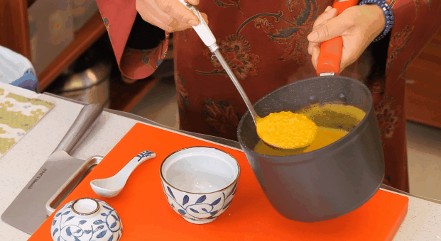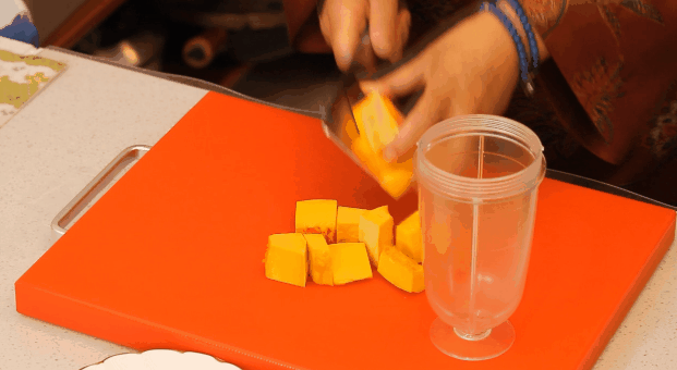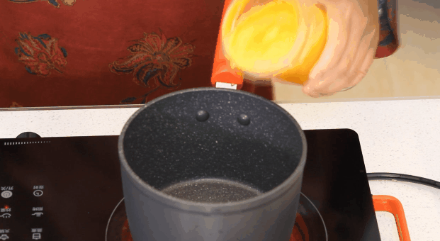 5、起火,把南瓜汁倒在锅里煮,再加水把杯子洗一洗