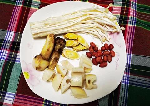 1、把提前准备好的莲藕粒、黄芪片、花生、鲜松茸片放入电炖炖锅;