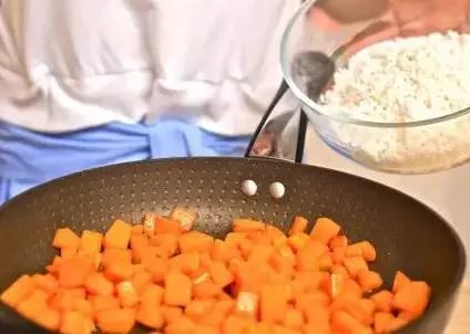 将南瓜去皮切丁,与米饭一起煮,营养均衡,也不会摄入过多油脂和糖分。