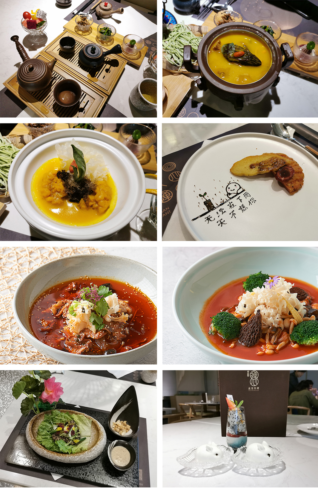 养生男女功夫汤起了一个“花开见佛”的名字,由两把像功夫茶一样的小茶壶装着两种不同的汤水,一壶有党参的药材味适合女士喝,另一壶带马蹄的清爽味给男士的,太有心思了!素佛跳墙采用南瓜浓汤制作,浓郁香甜,丝毫不差荤,与猴头菇等各种菌菇的味道非常贴合,既带出菌菇的鲜味,又略带粗粮的厚实感,轻薄不腻人。金耳竹丝燕非常细腻和鲜美,把几种黄耳的呆滞感中和掉,满满的胶质,鲜嫩爽口。椒汁素心排有三片,分别是素肠、豆皮和素扒,各是不同的味道,摆盘特别温馨,写上“无法在下雨天不想你”。水煮山珍有点像吃毛血旺,里面尽是木耳、竹笙、菌菇等食材,口感爽脆,吃完还想吃。最后记得上一道精致的甜品哦,超满足的!番茄鲜籽蔬用浓稠的番茄汤汁熬制而成,再巧妙运用菌菇搭配,整道菜品健康生态,香浓可口。藜麦沙拉食材营养,包括藜麦、玉米、紫薯、提子、蔓越莓、银丝菜、青瓜花、鹰嘴豆,再配上腰果、沙拉酱,口感异常丰富,细嚼慢咽,美的享受!