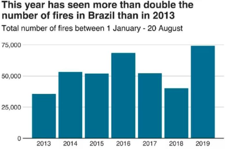 据统计,今年巴西发生7万多起火灾,亚马孙地区占一半以上火灾。与去年同期相比,增幅超过80%。
