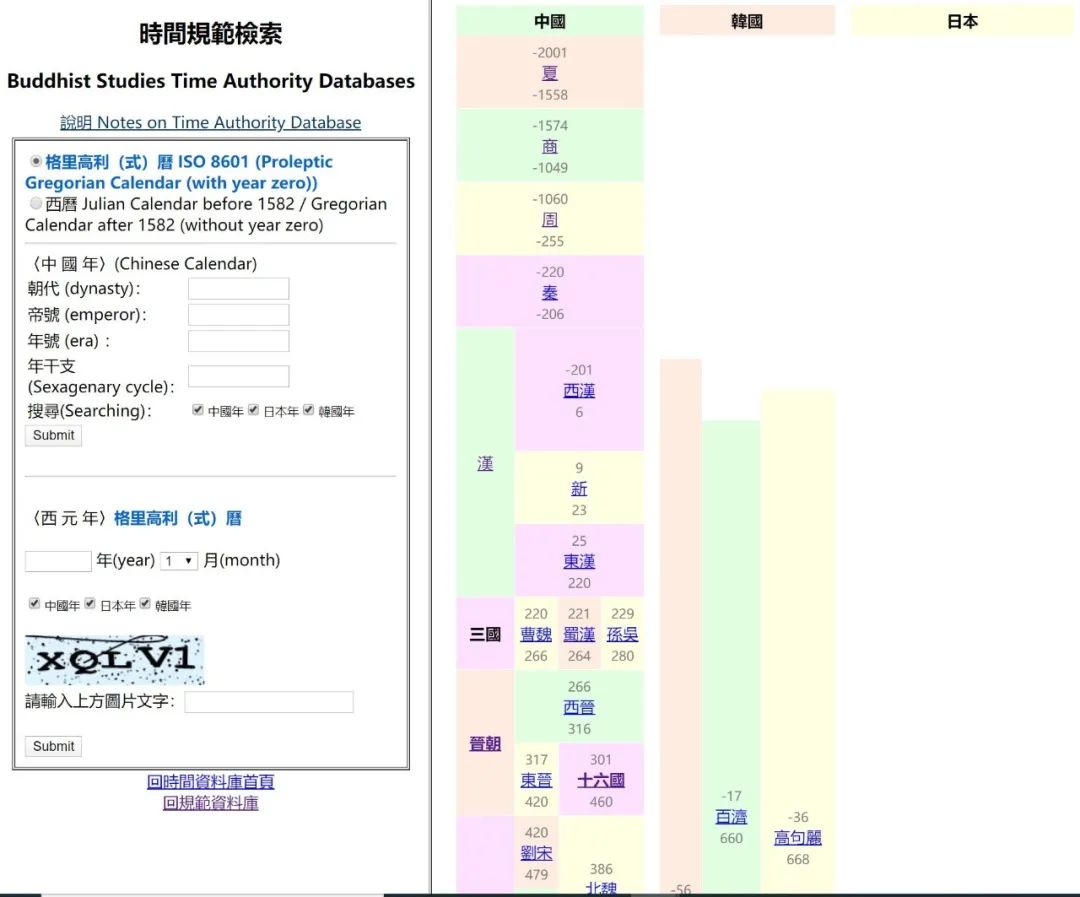 提供中日韩西曆时间对照,日期规範码查询,干支年月查询。最大特色为提供并行东亚年代的展示。目前可查询时间範围由秦始皇帝元年(BC 220/11/14) 至现今。