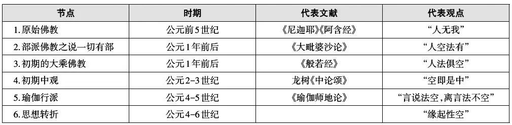 这里只讨论印度佛教的情况。印度佛教大致可以分为原始佛教、部派佛教和大乘佛教几个时期,这里选取其中的六个关键节点,根据其代表文献对各个时期的空观做一个简要的梳理(见下表)。