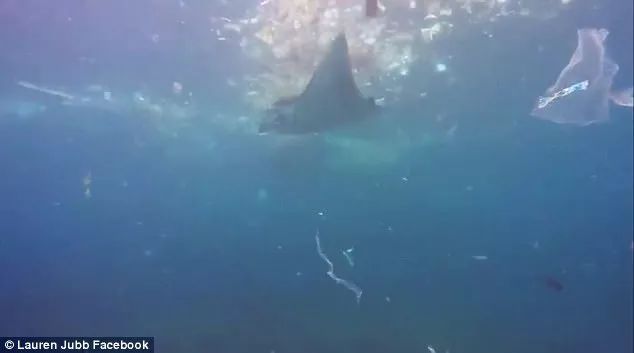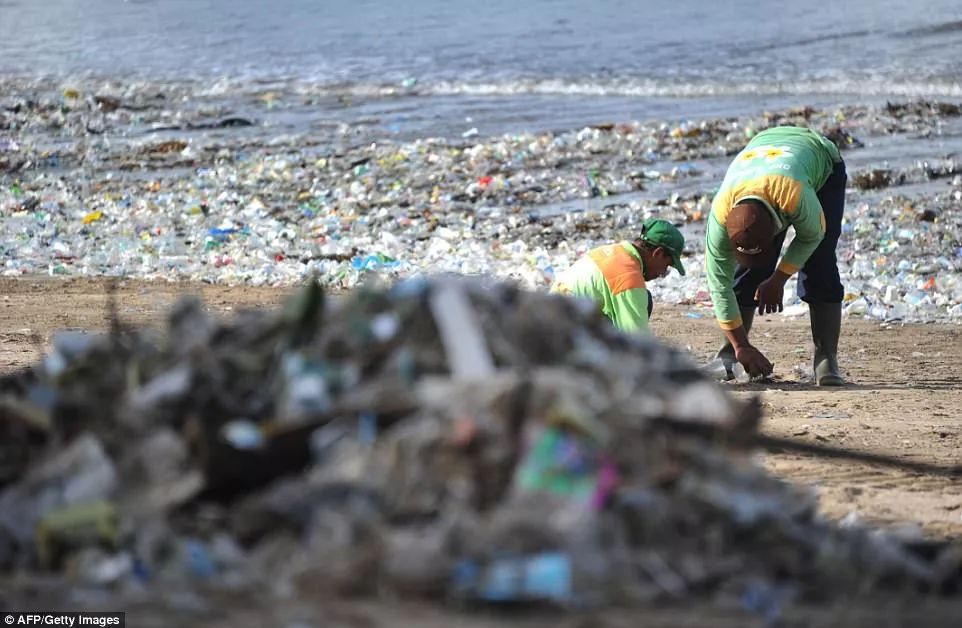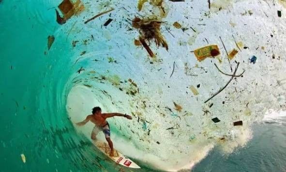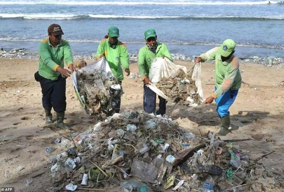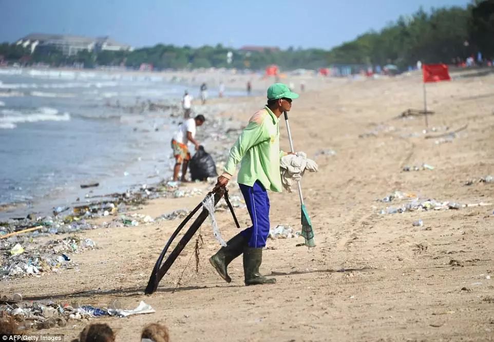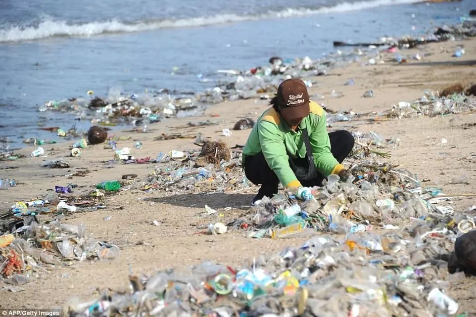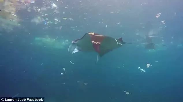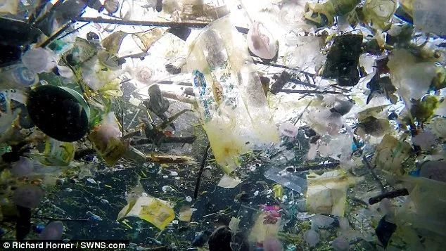 各种各样的塑料垃圾充斥着这里蔚蓝的海水。