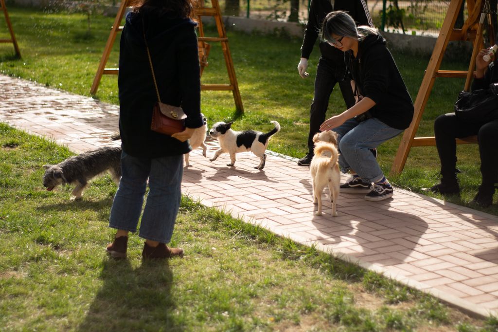 大家带着狗狗到花园里到处玩,