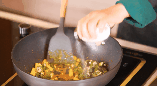 7、然后加盐 炒到秋葵吐丝