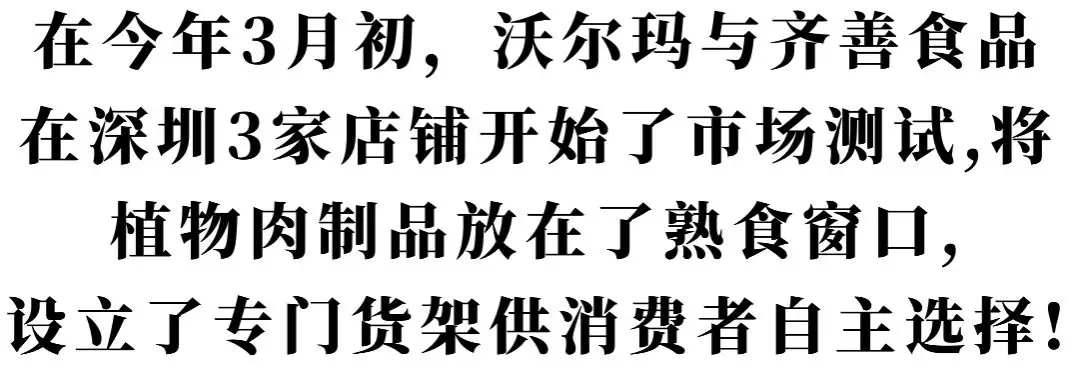 早在去年8月,中国首家植物肉生产公司齐善食品就通过了沃尔玛超市严格的供应商资质审核与全产业链和验厂审核。在今年3月初,沃尔玛与齐善食品(中国最大的植物肉生产商)在深圳3家店铺开始了市场测试,将植物肉制品放在了熟食窗口,并且设立了专门货架供消费者自主选择。