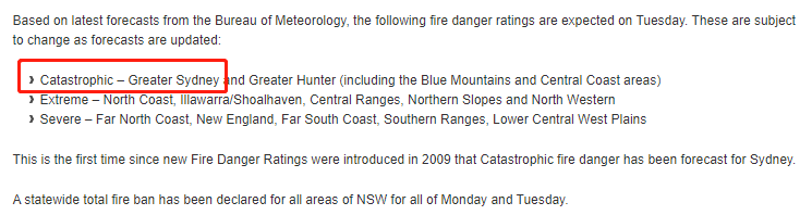 其中悉尼市区已经划入最严重的红色分级(Catastrophic)!