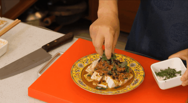 8、芹菜末放到豆腐上面,调好的汁淋上去