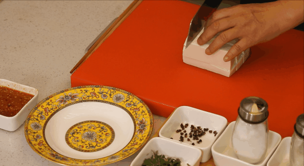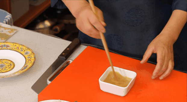 3、调芝麻酱,加温开水、盐、豆豉酱、糖、酱油,调均