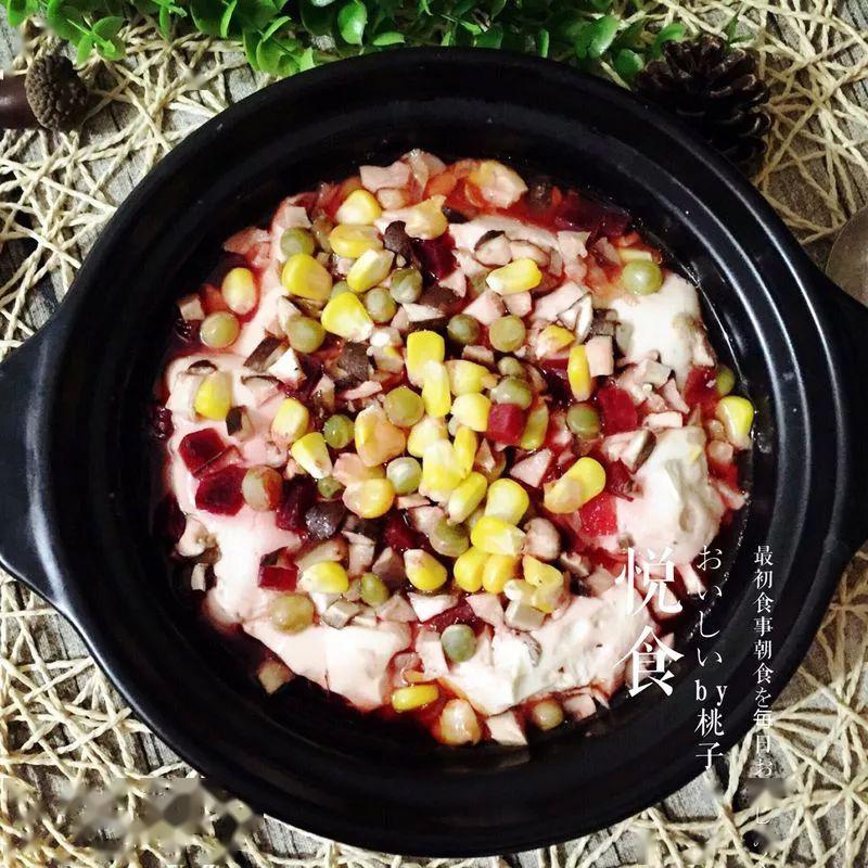 2. 香菇、甜菜根切小块儿铺在豆腐上