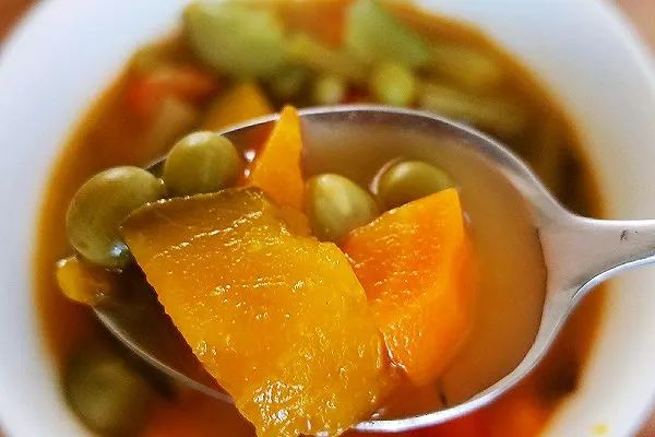 6. 水开加青豆,南瓜和黄瓜,继续煮半个小时就可以了