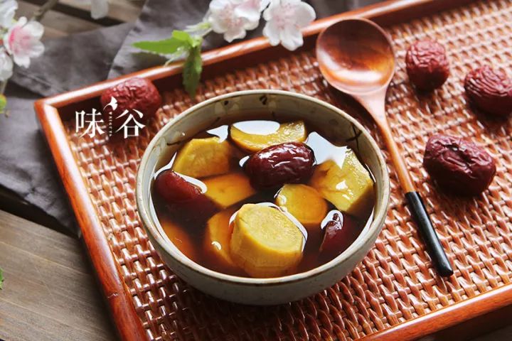 3. 锅中加足量水,放入姜片、红枣、红薯块,大火煮开后转中小火煮30分钟