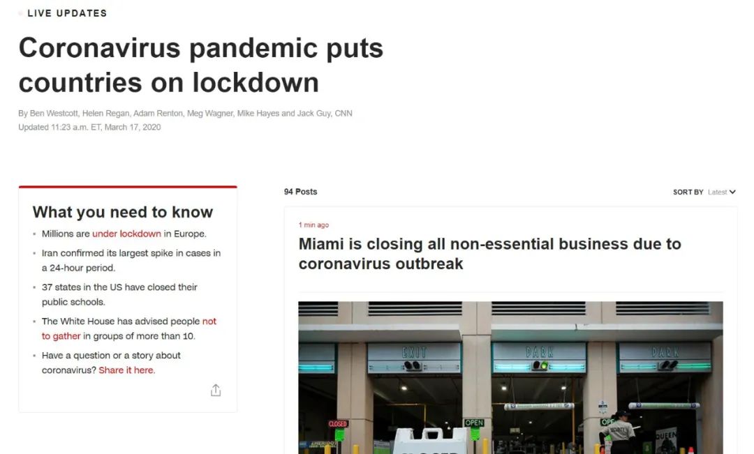 据美国有线电视新闻网(CNN)报道,冠状病毒大流行目前已造成全球6500多人死亡。病毒在全球迅速传播,韩国、意大利和伊朗是中国以外受影响最严重的国家之一。约16.9万人被证实感染,一些国家和城市已采取社交安全距离的措施,试图减少传播。