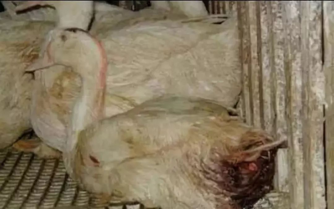这些鹅,长期被插管喂食,它们的嘴巴和喉咙已经严重受伤,食道已经溃烂,以至于每天喝下去的水流经溃烂处都会变成血水,更严重的鹅每天都会有血便。