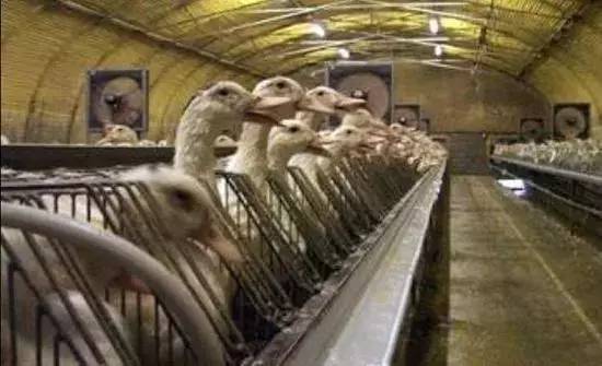幼鹅被关押在狭小拥挤的小笼子,铁栅栏外只露出一排排脖子,固定在专门训练颈部肌肉的架子上。