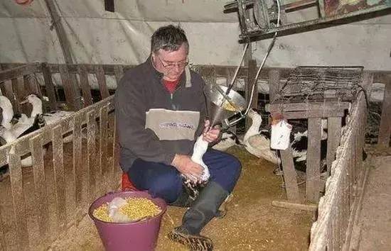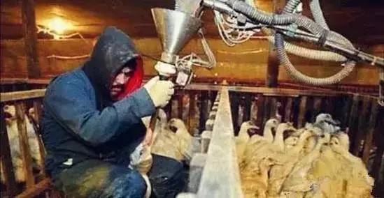 农场主每天增加喂食量,不择手段地把小鹅的胃撑大。