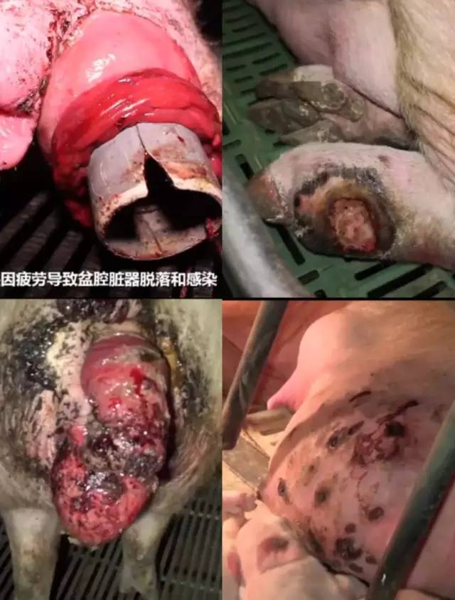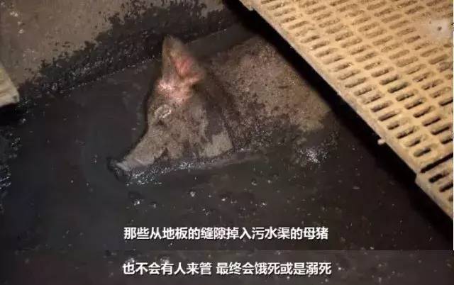 母猪试图钻出牢笼摆脱这种命运,但一切都是徒劳,从地板缝钻出去的母猪,跌进肮脏的化粪池,很多被活活淹死。