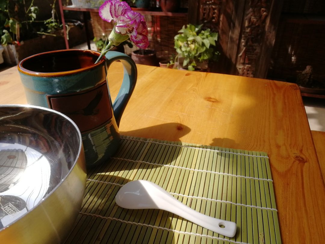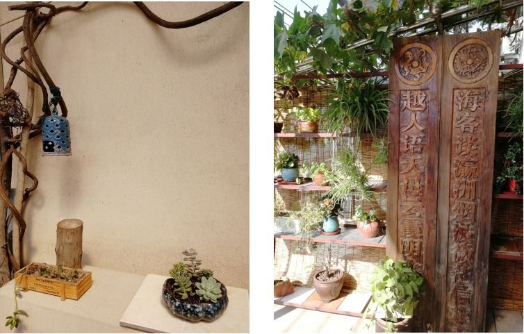 工作中的减塑,养成了我们处处环保的习惯,也给我们的工作和生活带来了另外的情趣。我们工作室的小院,花花草草点缀其中,温馨、惬意。那个放花草的金属架子与刻诗木牌都是从旧货市场淘来的;一个轮胎盆栽,是我的“座驾”换下来的旧轮胎,正面喷上一点漆,做成了花盆架,与绿植相映成趣;还有一盆多肉花盆塑料底托烂的不能使用后,我试着用捡来的小块瓷砖代替花盆塑料底托,加上树藤、瓷鸟窝,还挺和谐美观的。