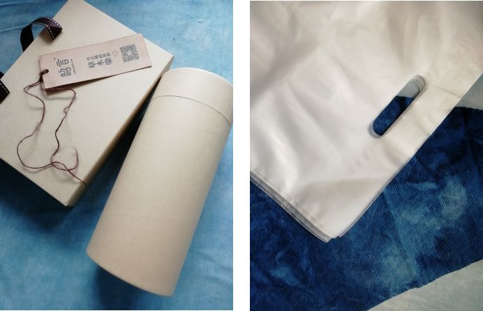 在生产过程中,我们对塑料制品会注意重复使用。这里的一些小塑料袋,是我三年前在工作室门前捡的。我们在设计一些需要避染的图案时,就用这些塑料袋包裹住,每次用后都清洗一下搭在绳子上晾干,然后反复使用,直到破的不能用了才扔掉,这样坚持三年多,捡来的这些塑料袋仅用了很少一部分。