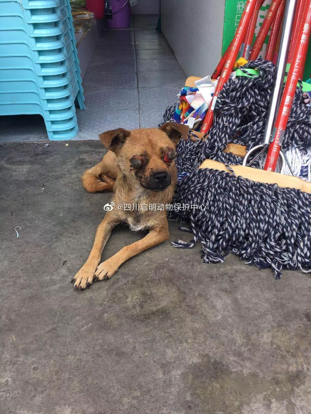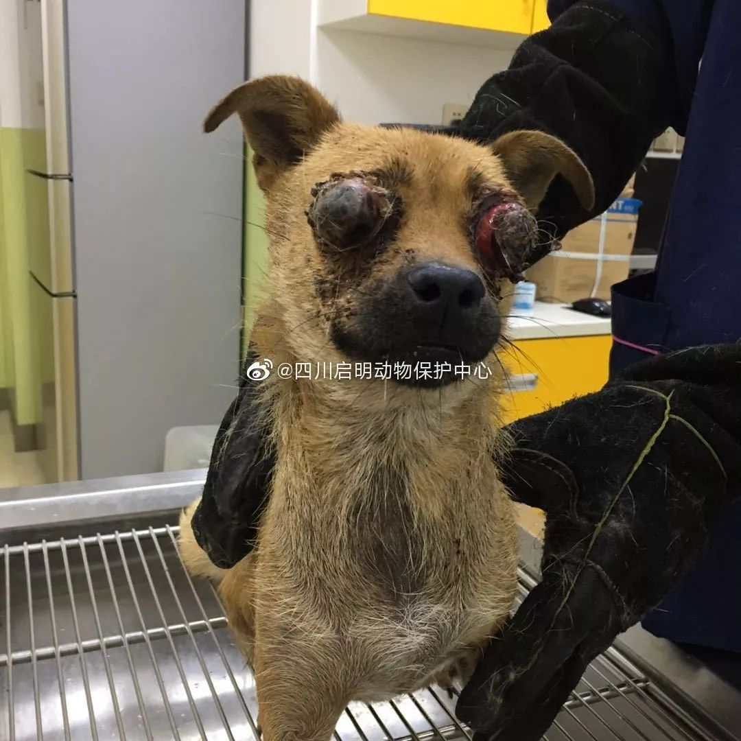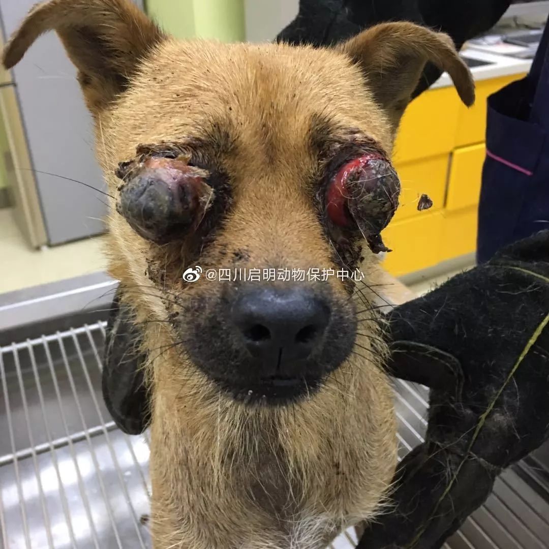 狗狗很老实,很乖,忍受着巨大的疼痛和突如其来的黑暗艰难的生存着。狗狗疑似一周前被车撞伤头部,眼球脱落眼眶,双眼溃烂,估计以后视力不保。请开飞车的朋友们注意一下,比你视线矮的还有小朋友和小动物。请多一分小心,不要成为造成另一个生命痛苦的黑手。