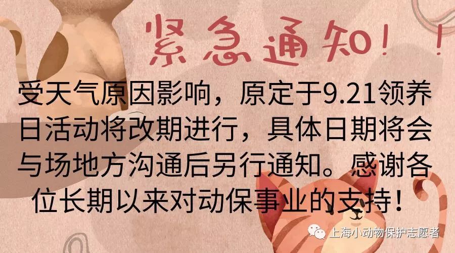 受天气原因影响,原定于9.21领养日活动将改期进行,具体日期将会与场地方沟通后另行通知。感谢各位长期以来对动保事业的支持!