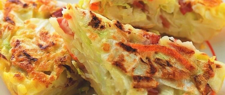 材料:糯米粉20g、面粉80g、水130ml、葵花油1茶匙、盐、胡椒粉、胡萝卜丝25g、卷心菜丝200g。
