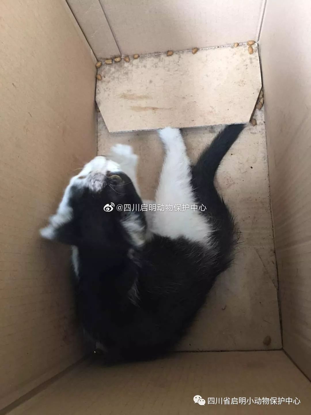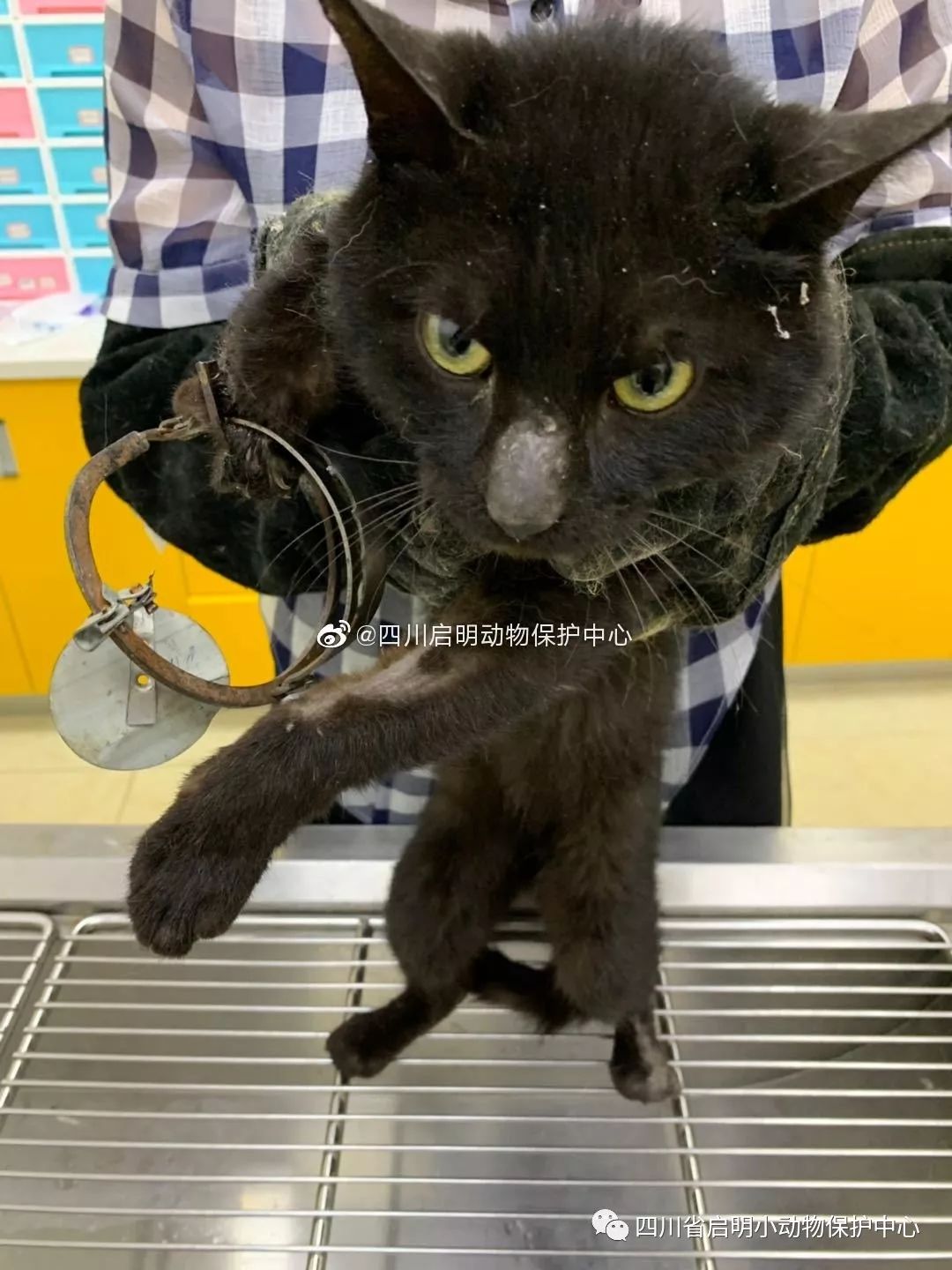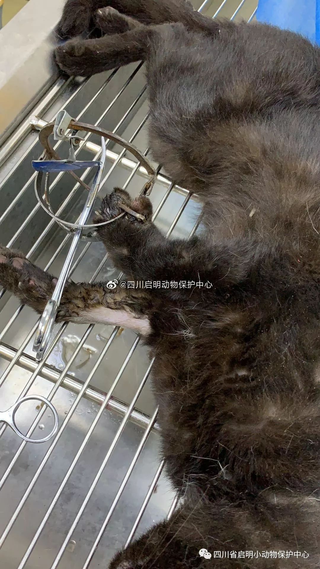 这是五月份在成都市保利城二期救助的一只小黑猫。前脚被捕狗夹夹住,小小的一只,缩在垃圾桶的角落里。当时将这只小猫送往定点医院诊治。